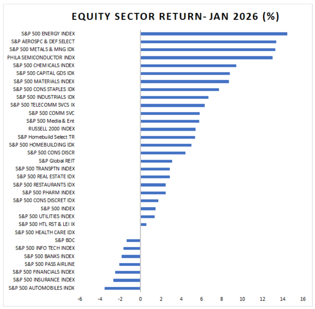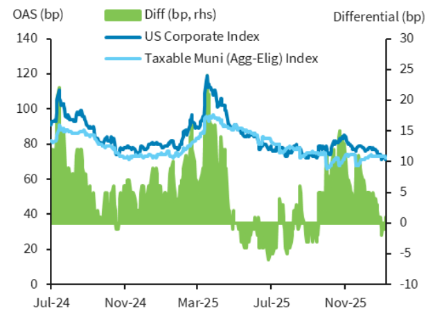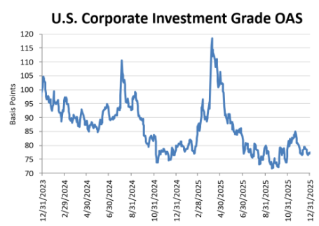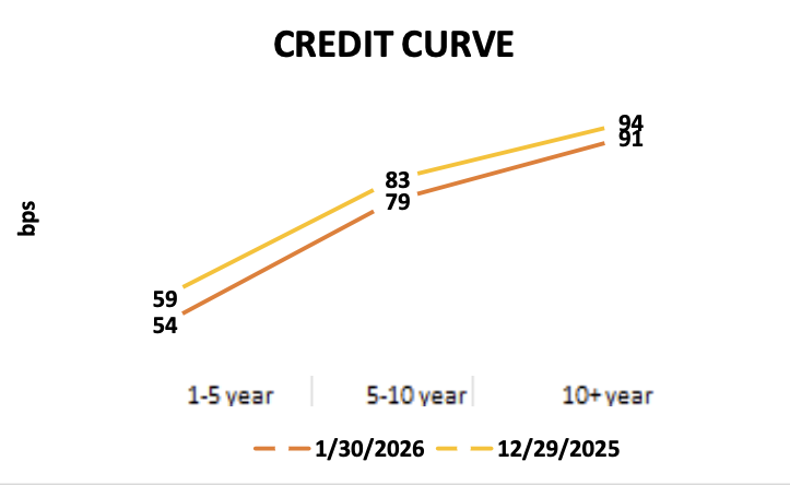Fixed income markets delivered solid performance in January as strong demand technicals, resilient risk appetite, and the market’s ability to absorb heavy issuance supported returns across sectors. Investment-grade corporate spreads tightened to multi‑decade lows, while securitized products strengthened meaningfully, particularly Agency MBS, which benefitted from an announced $200 billion GSE purchase program that drove spreads sharply tighter over the month. Municipal bonds also outperformed amid favorable seasonal reinvestment flows and lighter‑than‑expected supply. A key late‑month development was the nomination of Kevin Warsh as the next Federal Reserve Chair, which introduced policy uncertainty and caused sharp moves in commodities but was largely absorbed by fixed-income markets, with credit conditions remaining firm and risk sentiment intact.