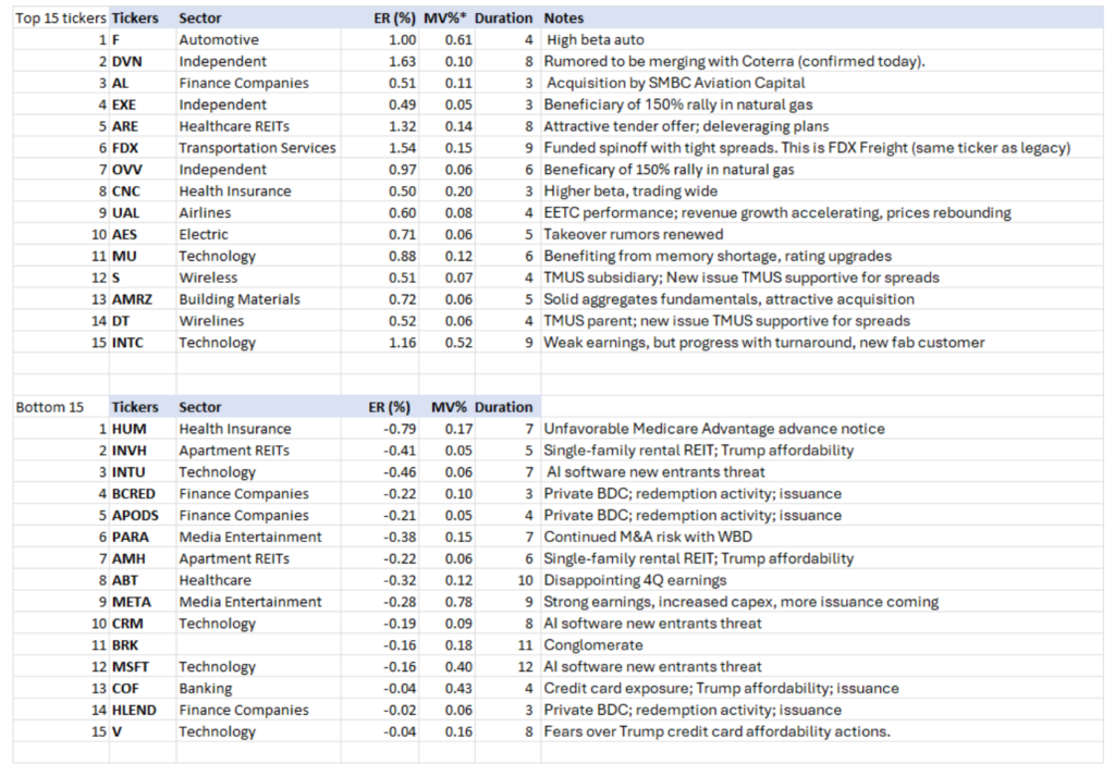 The following shows the top and bottom performing issuers based on ‘excess return per unit of duration’. This list excludes those with market values less than 0.05% of the Bloomberg Corporate Index as well as emerging markets. AAM’s analysts have provided an explanation for issuer performance when relevant.