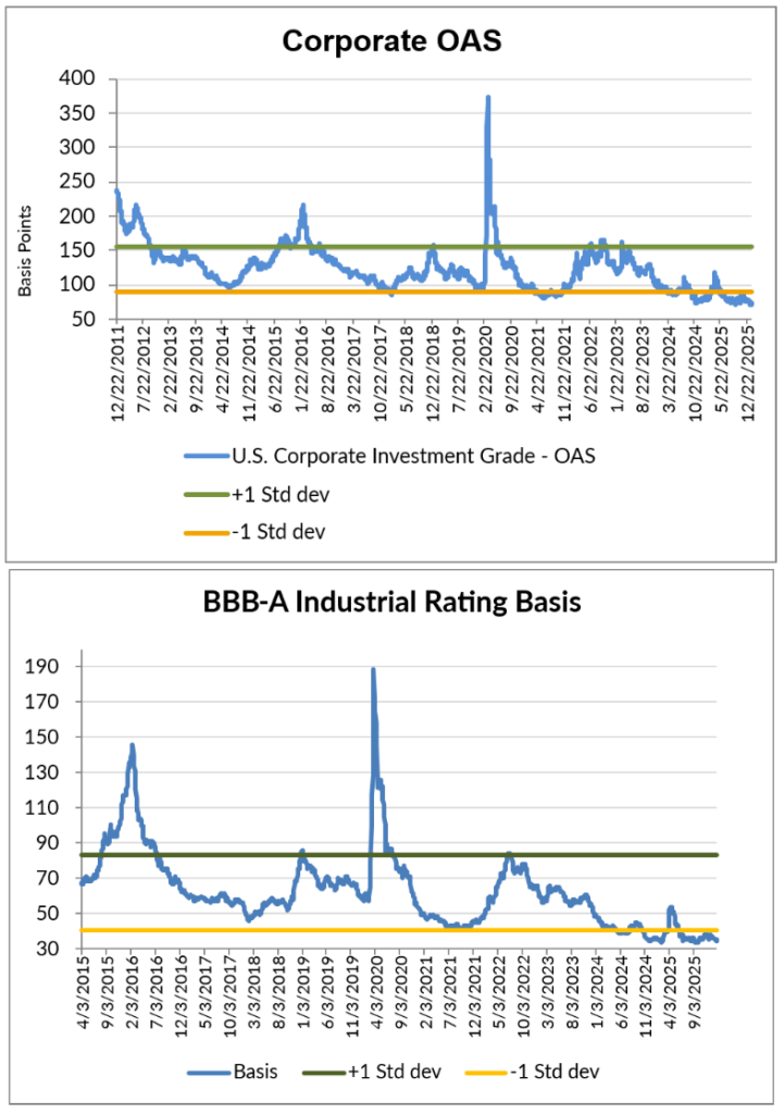Corporate spreads tightened to levels last seen in 1998, driven by a positive tone towards risk and favorable technicals. Single-A bonds underperformed Triple-Bs, and Autos, Technology and Energy outperformed Retail, Insurance and Healthcare (see ticker level details on the next section). Statistically, Communications, Financials, and Cyclicals are offering more value than Defensive and Commodity-related sectors.