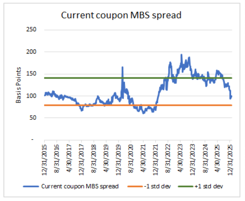 Current-coupon RMBS spreads delivered another month of positive excess returns, tightening on GSE- and policy-related headlines. The announcement of $200 billion in GSE MBS purchases drove spreads sharply tighter, narrowing by 13 basis points over the month. Spreads briefly reached a low of 94 bps, a level not seen since early February 2022. Mid-dollar discount coupons, particularly 30-year 4.00%–5.00% bonds, were among the strongest performers, while 30-year 2.50% bonds posted the highest excess return at 81 bps. Ongoing buying from FNMA and Freddie Mac remained concentrated in 30-year 4.00%–5.00% coupons, while money managers increased allocations to 2.50% coupons.