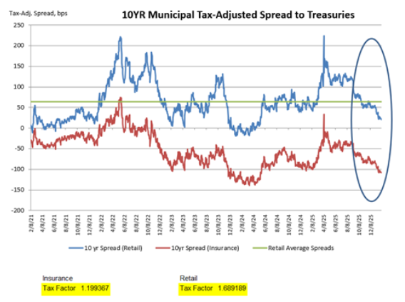New issuance for January came in at very modest $1.27B, producing a decline of 24% relative to issuance in January 2025. We expect this modest issuance cycle to continue for most of the year and be supportive of current relative valuation levels. (Source: BofA, Bond Buyers, Bloomberg)